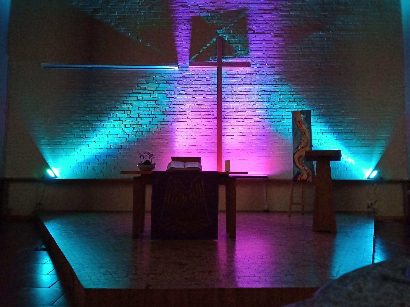 Innerhalb von 3 Tagen hat Wolfgang mit einem klein Team den ersten Gottesdienst ins Netz gebracht. Und seit dem sind wir live. Jeden Sonntag um 11 Uhr. Ganz ehrlich – wieviel für einen Live-Gottesdienst an Vorbereitung, Proben und Arbeit im Hintergrund nötig ist, hätte ich im Leben nicht gedacht! Denn: eine Kamera verzeiht nichts. Sie sieht jedes vergessene Verlängerungskabel, jede welke Blume und jede „Krusch-Ecke“ – und davon haben Kirchen eine ganze Menge. Außerdem schluckt die Kamera 30% alle Bewegungen und Emotionen. Das heißt: Meine Mimik und Gestik, die ich normalerweise Sonntagsmorgens so an den Tag lege, reicht fürs Internet einfach nicht aus. Wenn ich im Stream lebendig und fröhlich rüberkommen will, muss ich mich vor der Kamera wie ein Eichhörnchen auf Speed fühlen.