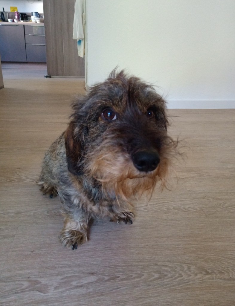 Nach gut 40 Minuten hatte ich es geschafft. Die Wolle war runter und ich wieder ein ansehnlicher Dackel. Nichts mehr zu sehen vom geplatztem Sofakissen, sondern nur noch ein adretter Dackelmann. Endlich durfte ich vom Tisch runter. Aber einfach gehen wollte ich nicht! Schließlich fehlte noch die Belohnung – mein wohlverdientes Leckerchen. Und weil es heute irdendwie besonders viel Gezuppel und Geziepe gab, hab ich mir gleich noch nen Zweites abgeholt. Gut, dass Frau Horst so ne große Leckerchendose hat. 🙂