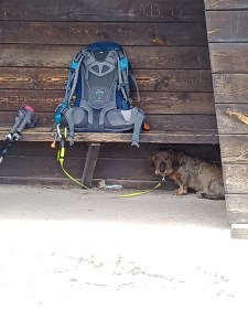 Ein Stückchen später überholt uns ein Päärchen mit 3 Dackeln. Schnell kommen wir ins Gespräch. Theo ist auch sehr interessiert an dem Dackelherrchen. Doch als er sich eine paar Streicheleinheiten abholen will, wird die Dackeldame einversüchtig. Das ist ihr Herrchen und da hat Theo nichts verloren, macht sie ihm durch ihr keifendes Bellen deutlich. Theo hat die Nase voll und verkriecht sich hinter meinen Beinen. Wir warten noch ein bißchen bis die anderen Dackel genügend Vorsprung haben, bevor wir weitergehen.