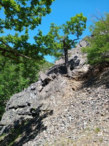 Auf einem kleinen Felsvorsprung machen wir Rast. Der Proviant, der uns für heute gepackt wurde, ist für das kurze Stück eigentlich viel zu viel. Ich bin ein wenig überrascht, als sich plötzlich ein älteres Ehepaar prustend neben uns nieder lässt. Sie brauchen dringend eine Pause sagen sie, denn der Aufstieg von Thale wäre sehr anstrengend gewesen. Hm, ob das am Alter der Beiden liegt? Denn ich hatte die Strecke bisher als sehr entspannt und gemütlich erlebt. Kurz nach unserer Rast, sehe ich aber, was die Beiden meinten. Denn es geht ziemlich bergab und ich bin mal wieder froh, den Hexenstieg von West nach Ost zu laufen und nicht anders herum. 😉